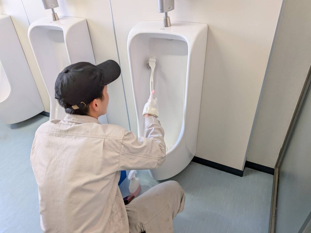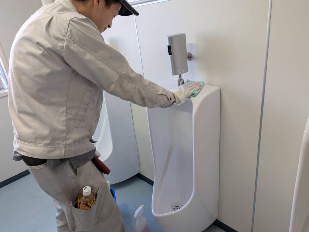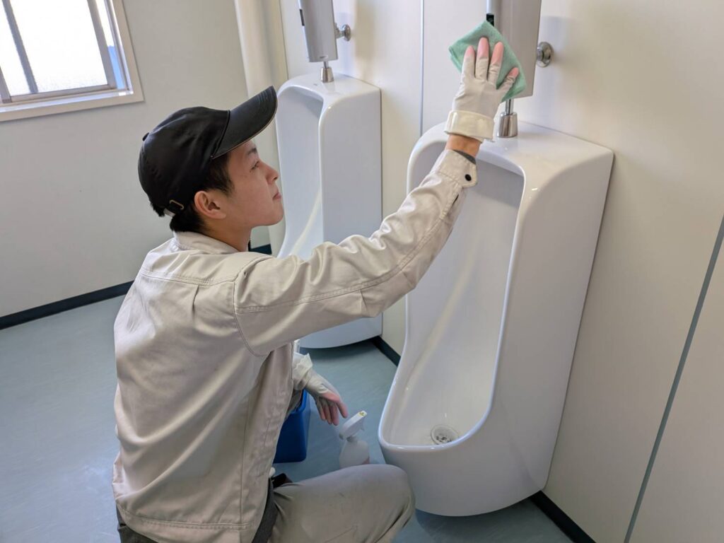 川崎市内のトイレ清掃現場にて朝から研修しました。